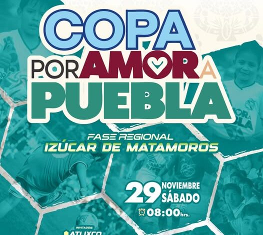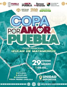 El Gobierno de Izúcar de Matamoros que encabeza el C. Eliseo Morales Rosales, a través de la Dirección de Deporte, invita a toda la ciudadanía a disfrutar del Torneo de Fútbol Estatal “Copa por Amor a Puebla”, Fase Regional, que se llevará a cabo este sábado 29 de noviembre a las 08:00 horas, en la Unidad Deportiva.