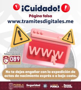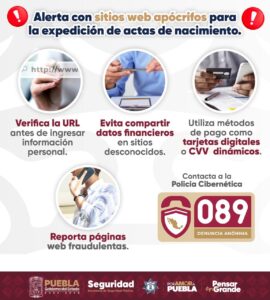 CIUDAD DE PUEBLA, Pue.- La Secretaría de Seguridad Pública (SSP) alerta a la ciudadanía sobre la creación de una página apócrifa para la expedición de actas de nacimiento en línea y hace un llamado a reforzar medidas de autocuidado para evitar ser víctima de ciberdelitos.