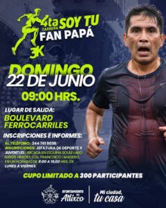 El Ayuntamiento de Atlixco, encabezado por la presidenta municipal Ariadna Ayala, invita a la carrera recreativa “Soy tu fan, papá” el 22 de junio, con un circuito de 3 kilómetros. La actividad, dirigida a todas las edades, busca promover la convivencia familiar y un estilo de vida saludable.