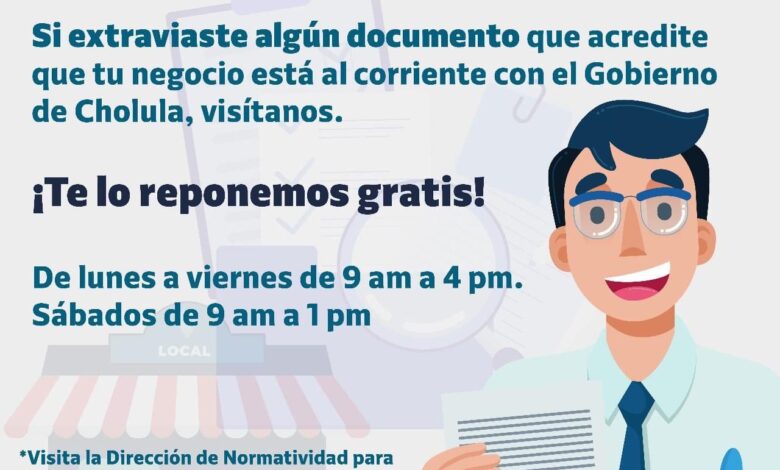 Otro apoyo más en favor de este sector va enfocado a la regularización de la documentación en todos los establecimientos comerciales, por ejemplo: si en alguno de los comercios se ha extraviado documentación que acredite estar al corriente con el gobierno municipal de San Pedro Cholula, los comerciantes lo podrán reponer totalmente gratis.