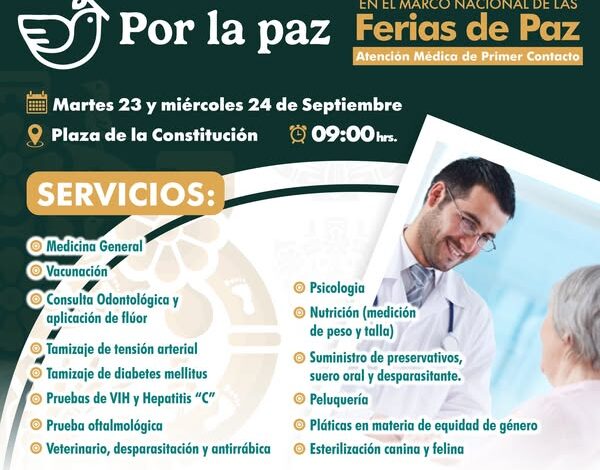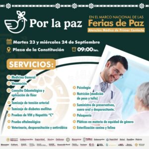 El Gobierno de Izúcar de Matamoros, que encabeza el C. Eliseo Morales Rosales, en coordinación con el Gobierno del Estado, invita a la Jornada de Atención Médica de Primer Contacto, que se llevará a cabo en el marco nacional de las Ferias de Paz, los días martes 23 y miércoles 24 de septiembre, en la Plaza de la Constitución, a partir de las 9:00 a.m.