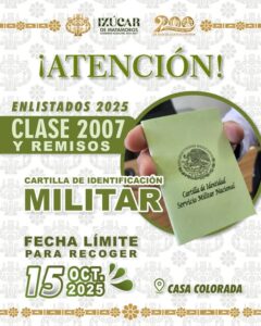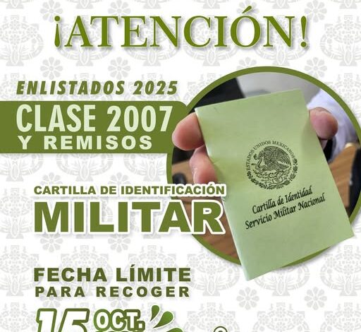 Se comunica a los jóvenes Clase 2007 y remisos que se enlistaron este año y que no han comparecido a la toma de huellas, que la fecha límite para recoger su Cartilla de Identidad Militar será el 15 de octubre del presente año.