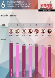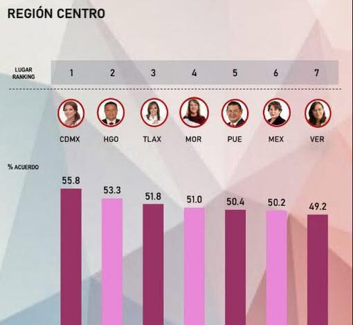 En la cuarta posición se ubica Margarita González, gobernadora de Morelos que tiene una aprobación de 51%, mientras que Delfina Gómez del Estado de México y Rocío Nahle de Veracruz, quedaron en los lugares 6 y 7 con 50.2% y 49.2% de aprobación.