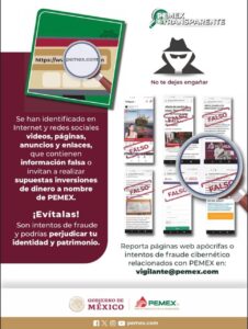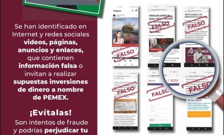 Se han identificado en Internet y redes sociales videos, páginas, anuncios y enlaces, que contienen información falsa o invitan a realizar supuestas inversiones de dinero a nombre de #PEMEX.