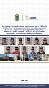 La Fiscalía General del Estado de Puebla informa que como resultado de un operativo interinstitucional realizado por tierra y aire en el municipio de Amozoc, orientado a la localización de personas reportadas como desaparecidas, se logró la detención de 11 personas, el aseguramiento de inmuebles y diversos indicios relevantes, incluyendo armas de fuego, narcóticos y un vehículo. El dispositivo fue desplegado tras denuncias realizadas en los últimos tres días ante la FGE, correspondientes a desapariciones ocurridas a principios de agosto del presente.