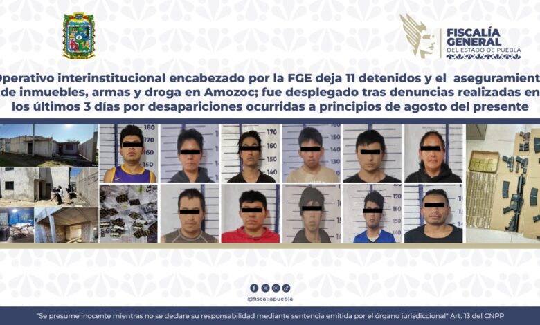 Operativo interinstitucional encabezado por la FGE deja 11 detenidos y el aseguramiento de inmuebles, armas y droga en Amozoc; fue desplegado tras denuncias realizadas en los últimos 3 días por desapariciones ocurridas a principios de agosto del presente