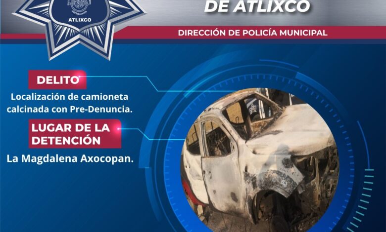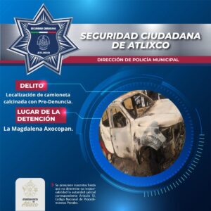 La Secretaría de Seguridad Ciudadana de Atlixco informó la localización de una camioneta calcinada con pre-denuncia de robo, como resultado de recorridos permanentes de vigilancia y atención a reportes ciudadanos.
