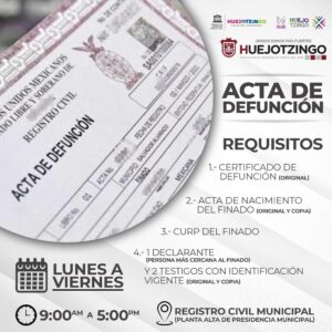 Si vas a tramitar un Acta de Defunción , acude a las oficinas del Registro Civil : Huejotzingo