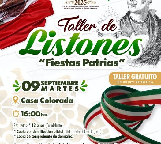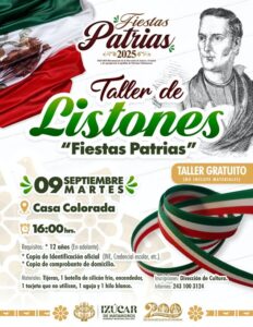 El Gobierno de Izúcar de Matamoros, que encabeza el C. Eliseo Morales Rosales, a través de la Dirección de Cultura, invita a la ciudadanía a participar en el Taller de Listones “Fiestas Patrias”.