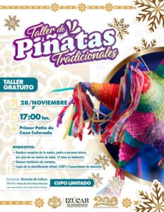 El Gobierno de Izúcar de Matamoros, que encabeza el C. Eliseo Morales Rosales, a través de la Dirección de Cultura, te invita al Taller Gratuito de Piñatas Tradicionales.