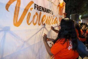 Al finalizar el recorrido, las y los participantes se reunieron en la explanada de la Plaza de la Concordia, donde se realizó el llenado de una lona con mensajes a favor de la erradicación de la violencia.