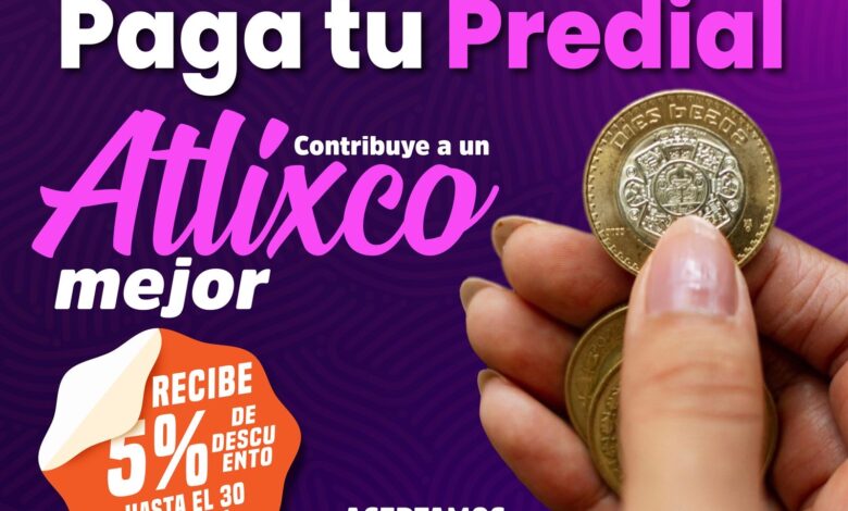 El Gobierno Municipal de Atlixco, presidido por Ariadna Ayala, recuerda a los contribuyentes que aún están a tiempo de aprovechar el 5% de descuento en el pago de predial, vigente hasta el 30 de abril.