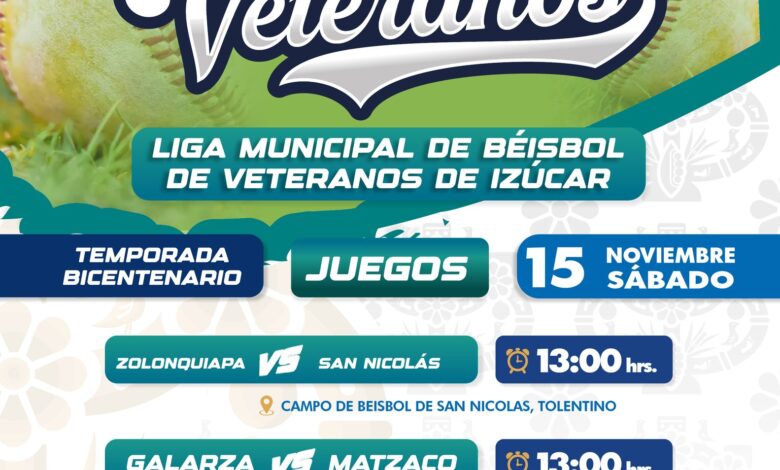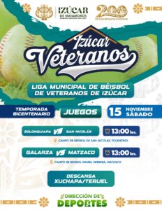 El Gobierno de Izúcar de Matamoros, que encabeza el Lic. Eliseo Morales Rosales, a través de la Dirección de Deportes, invita a todas y todos los aficionados al rey de los deportes a disfrutar de los emocionantes encuentros de la Liga Municipal de Béisbol de Veteranos de Izúcar este